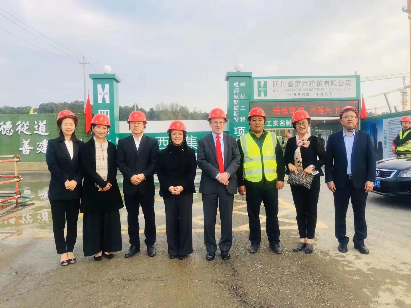 近日,英國駐重慶總領事館總領事艾佩詩女士(Ms Cecille EI Beleidi)、雙流區政府副區長王小樂一行調研由三分公司承建的威斯敏斯特學校項目。一踏進成都威斯敏斯特學校項目,總領事被繁忙的工作場景所吸引,建設現場熱火朝天、井然有序,鋼筋混泥土支柱拔地而起,龐大的校園輪廓已勾勒成形!綠樹環繞的淺山背景,形成了成都威斯敏斯特學校獨有的天際線,環繞學校的小河,岸邊的蘆葦和不時略過的飛鳥,已然形成一幅綠色、自然、生態的學校畫面。總領事詳盡詢問了項目的建設計劃和執行情況,由衷地贊嘆成都威斯敏斯特學校日新月異且優質高效的建設進度。目前,成都威斯敏斯特學校項目正按照既定目標順利推進,部分區域地下室底板施工已完成,1-A、1-C教學樓,2、3號學生公寓基礎施工已完成,預計2020年9月建成開學。