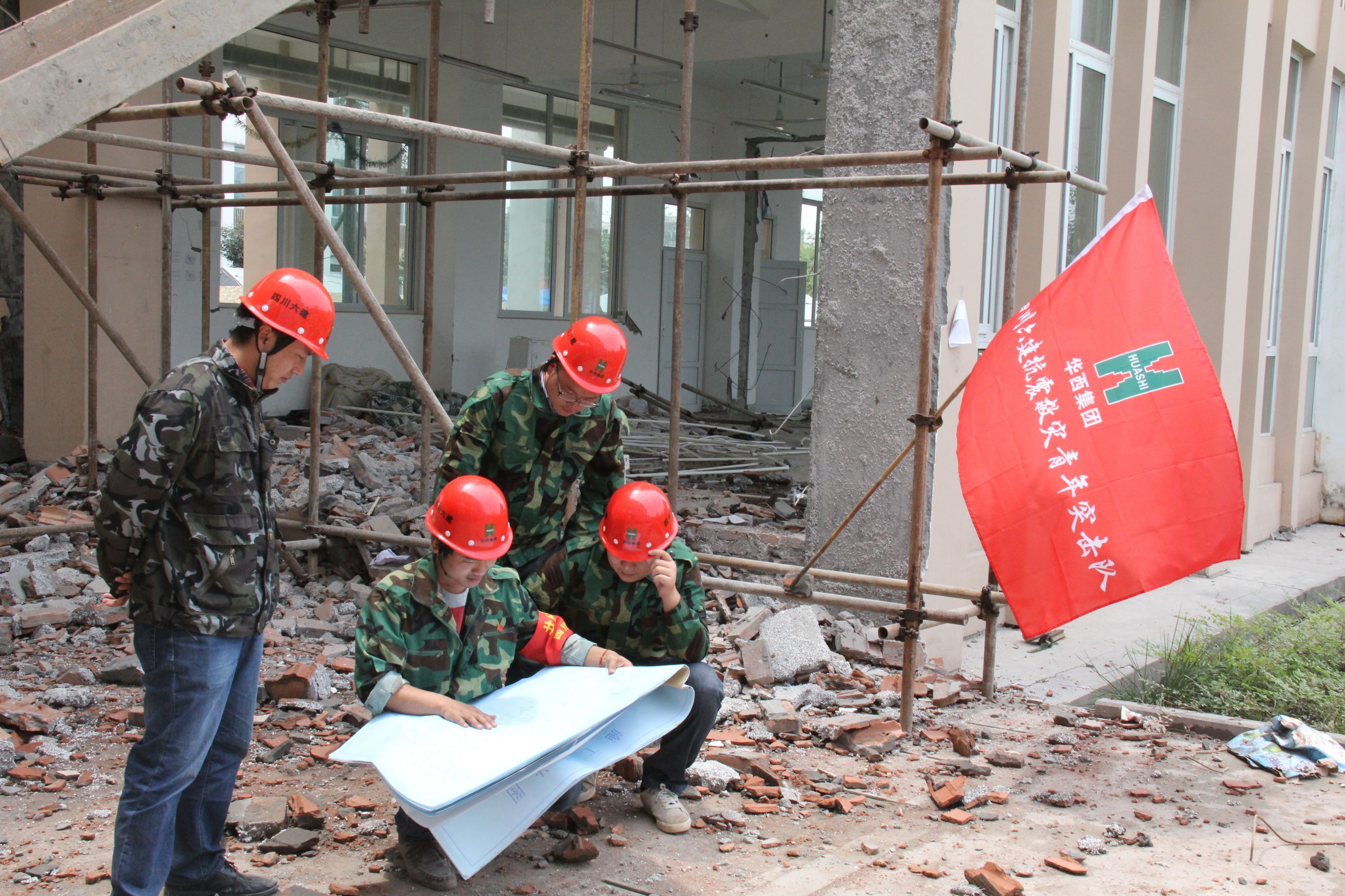 青年突擊隊在蘆山地震現場進行房屋鑒定工作